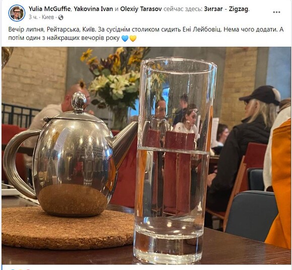 Шеф-редактор сайта «Новое время» Юлия Мак Гаффи на своей странице в Фейсбук обнародовала неожиданную новость: в Киеве находится легендарный американский фотограф Энни Лейбовиц. Юлия встретила знаменитость в столичном кафе Zigzag. Об этом журналистка написала в своем Фейсбук. «Вечер июля, Рейтарская, Киев. За соседним столиком сидит Эни Лейбовиц. Нечего добавить. А потом один из лучших вечеров года», – написала Мак Гаффи, опубликовав фотографию с иностранной гостью.