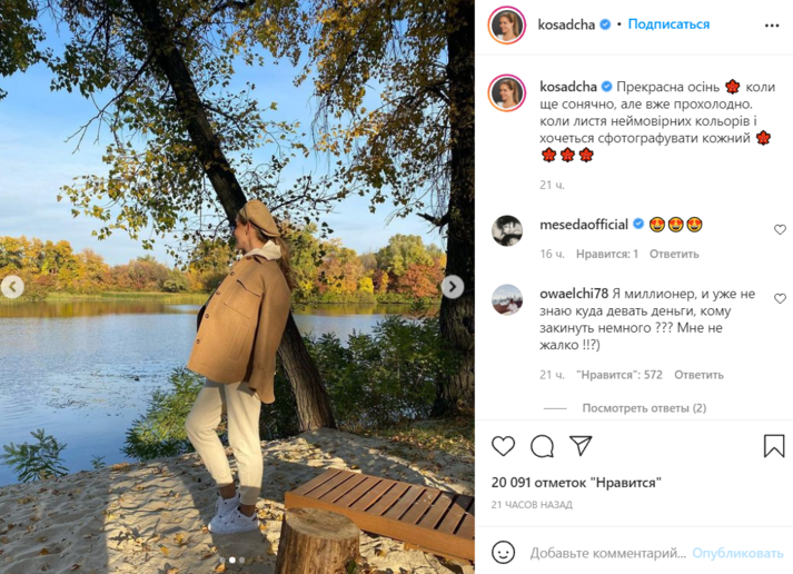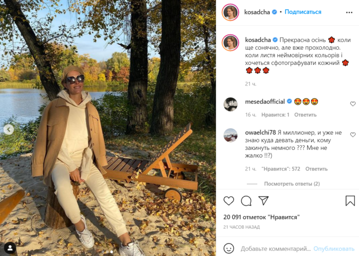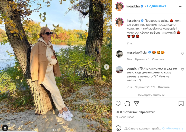 Телеведущая устроила осеннюю прогулку возле озера и среди деревьев. Она позировала перед объективом в нежно-бежевом спортивном костюме от украинского бренда Poustovit, дизайнера Лилии Пустовит. Комплект состоял из штанов и худи.