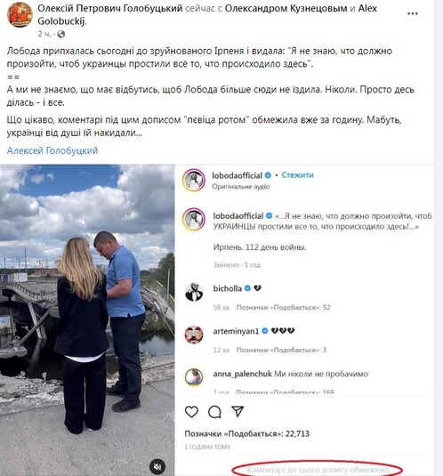 Визит артистки вызвал неоднозначную реакцию в сети. «Сказать, что я в шоке – это ничего не сказать! И многие люди ей улыбались.... Между тем, она все время войны покоряла сцены эрефии. Это типа переобулась, спела украинскую песню и все хорошо? Ждем теперь Повалий, Лорак, Егорову, а за ними и весь певческий русский бомонд», – написал телеведущий телеканала ICTV Петр Демьянчук. «Лобода приехала сегодня в разрушенный Ирпень и издала: «Я не знаю, что должно произойти, чтобы украинцы простили все то, что происходило здесь». А мы не знаем, что должно произойти, чтобы Лобода больше сюда не ездила. Что интересно, комментарии под этим сообщением певица ограничила уже через час», – пишет политтехнолог и блогер Алексей Голубицкий.