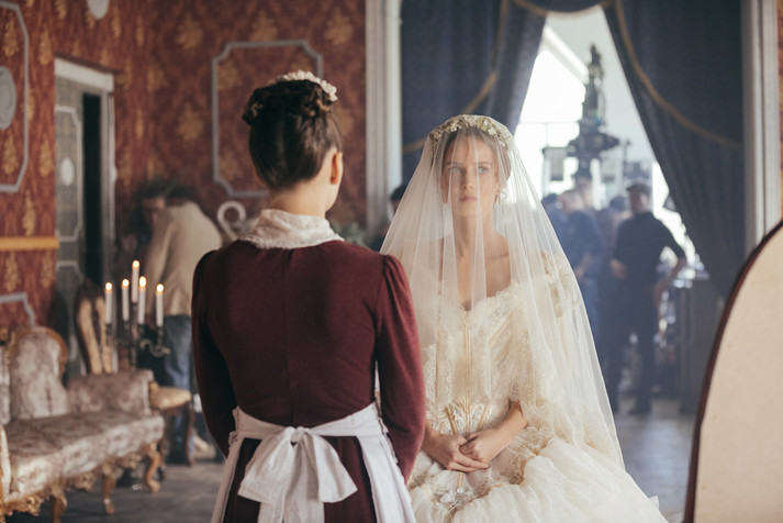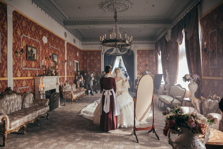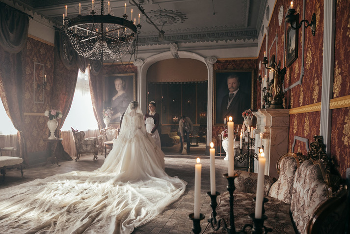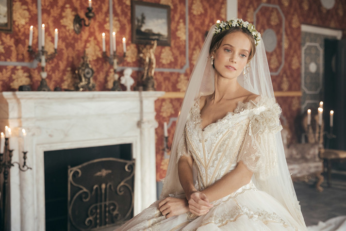 «В 19 веке не могло быть шлейфа длиною в 5 метров, но такая была задумка продюсеров, поэтому мы немного отошли от достоверности ради красоты и эффектности», - комментирует Дмитрий. - К слову, свадебное платье, созданное для проморолика – самый дорогой наряд всего сериала».