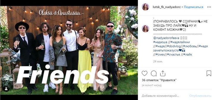 На свадьбе присутствуют близкие друзья пары: Катя Осадчая и Юрий Горбунов, Владимир Дантес и Надя Дорофеева,Тина Кароль с менеджером Павлом Орловым, композитор Руслан Квинта, Полина Логинова, Алла Кудлай, Соня и многие другие.