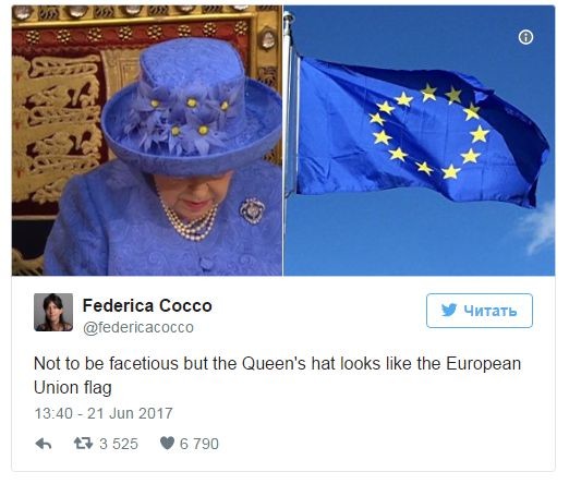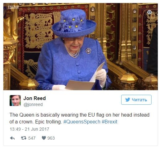 Таким образом, предположили в Twitter, королева «эпично затроллила» сторонников Брекзита и выразила свое несогласие с итогами прошлогоднего референдума, на котором большинство британцев проголосовало за выход из Евросоюза.