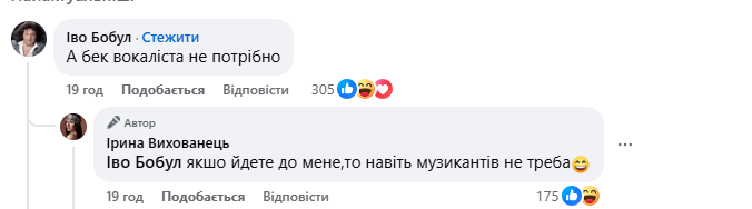 А ось народний артист України Іво Бобул не пройшов повз вакансії від Fiїnka. Учасниця кількох Нацвідборів на Євробачення оголосила, що шукає бек-вокалісту віком від 23 років. На відміну від Кацуріна, Ірина Вихованець шукає саме дівчину. Втім це не завадило 72-річному Іво Бобулу відгукнутися на вакансію.