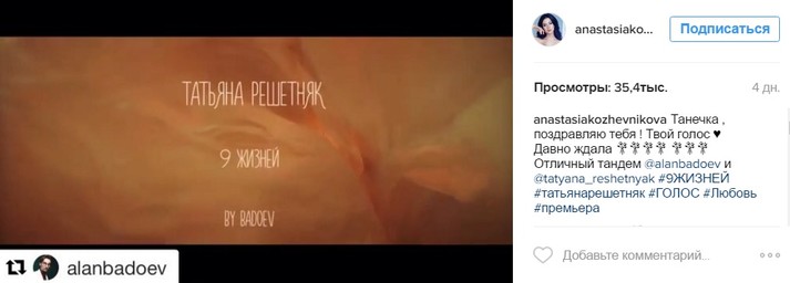 Новую работу артистки высоко оценили и коллеги по сцене. Певица LOBODA уверенна, что это только начало большого творческого пути Татьяны: «Алан Бадоев снял красивое видео для голосистой Тани Решетняк! Начинать всегда сложно. Но все будет».