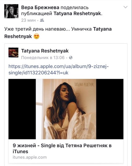 «9 жизней» Татьяны Решетняк за два дня на Youtube просмотрели более 200 тысяч человек. Клип занял 4-ю позицию в рейтинге популярности украинского сегмента крупнейшего видеохостинга, а имя певицы возглавило список поисковых запросов. В первый день премьеры в Facebook видеоработа артистки набрала 100 тысяч просмотров, Вконтакте – 65 тысяч, в Instagram – свыше миллиона, а сам трек на iTunes вошел в ТОП-100 лучших песен Украины и России.