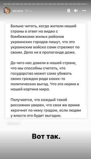 «Но уже пятый день у нас идет война. Все больше мирных жителей гибнет. Все больше домов, школ, садиков разрушено. Разрушены важные здания для обеспечения жизнедеятельности городов. Я с детьми сейчас в безопасности. Но мой муж и мама, семья младшей сестры в Киеве прячутся от бомбежек в подвалах. Потому что военные действия идут и в Киеве, и в Житомире, и в Харькове, и в Бердянске, и в Мелитополе, и в Херсоне, и в Чернигове, и в Одессе, и в Каховке и в других городах, селах. И все до единого украинцы молят русских солдат – не приходите. Не убивайте. Нет у этой войны смысла. Нет у нее оправдания. Нельзя ее продолжать. Остановите войну!»