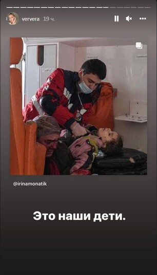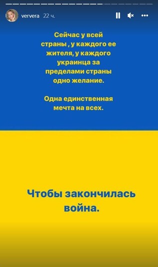 «Я никогда не делила наши народы, – пишет Брежнева. – Ни тогда, когда помогала тысячам людей и детей. Ни тогда, когда пела свои песни, обнимала и радовала. Мои мама и бабушка – русские. Папа и дедушка – украинцы. Оба народа – мои предки и моя кровь. Я родилась и живу в Украине. И сейчас у нас беда. У меня в подписчиках 32% русских. Я просто хочу, чтобы вы знали правду. И если в ваших силах что-то сделать – сделали это Мы до последнего не верили, что это произойдет».