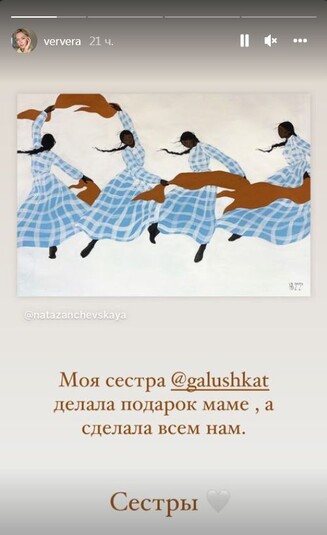 В своем микроблоге Вера Брежнева показала подарок, который ее сестра сделала для виновницы торжества. Это картина под названием «Четыре сестры» – по количеству дочерей Тамары Галушки. Еще один снимок певицы в соцсети – праздничный торт для мамы в виде цифр, украшенных свежей клубникой.