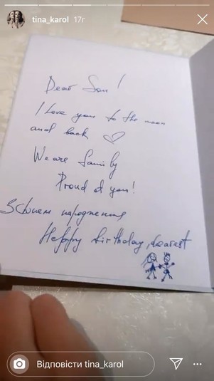 «Дорогой сынок! Я люблю тебя до Луны и обратно. Мы переполнены гордостью за тебя! С днем рождения, родной!» – написала Тина Кароль на открытке.