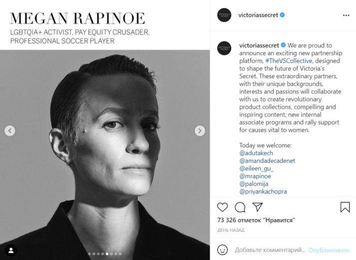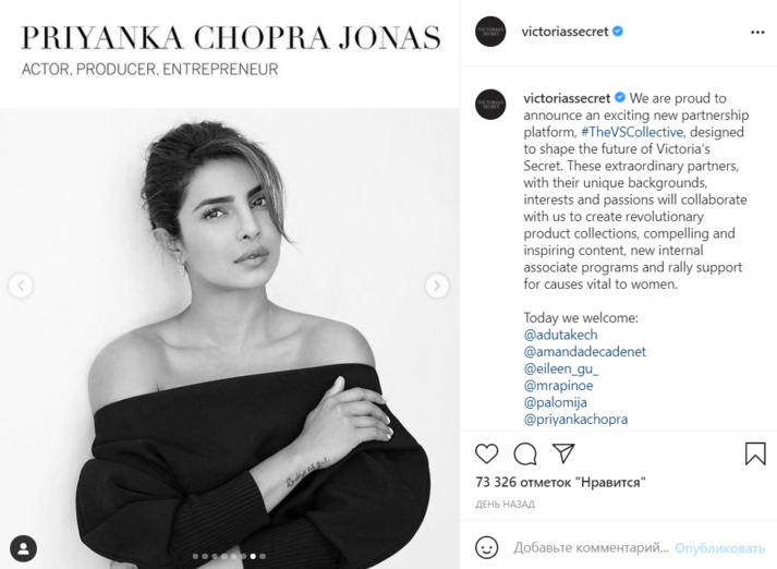 Теперь лицами Victoria’s Secret будут не только профессиональные модели, но и спортсменки, актрисы, активистки. Среди новых «ангелов» 35-летняя звезда футбола и активистка за гендерное равенство Меган Рапино, 38-летняя актриса и технический инвестор Приянка Чопра, 24-летняя бразильская транс-модель Валентина Сампайо.