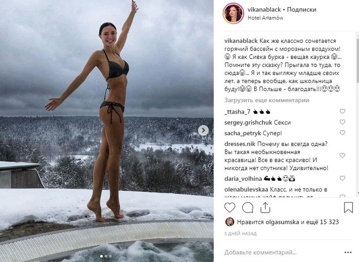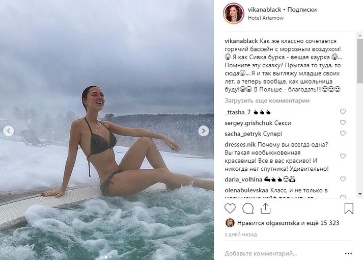 «Как же классно сочетается горячий бассейн с морозным воздухом! Я как Сивка-бурка - вещая каурка... Помните эту сказку? Прыгала то туда, то сюда! Я и так выгляжу младше своих лет, а теперь вообще, как школьница буду! В Польше - благодать!», - добавила Виктория.