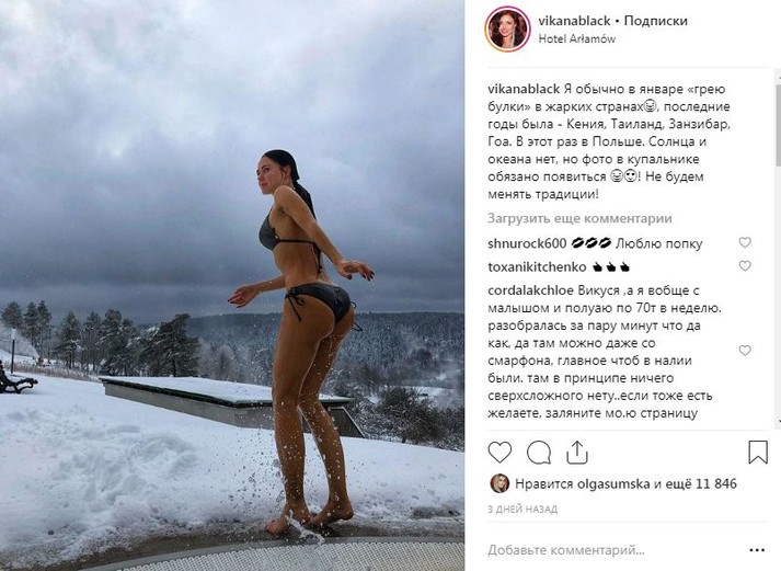 На своей страничке в соцсети, артистка поделилась снимком с морозного отдыха в Польше. Виктория покрасовалась в купальнике на фоне заснеженного пейзажа.