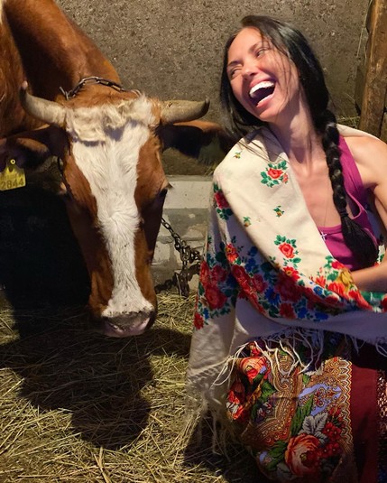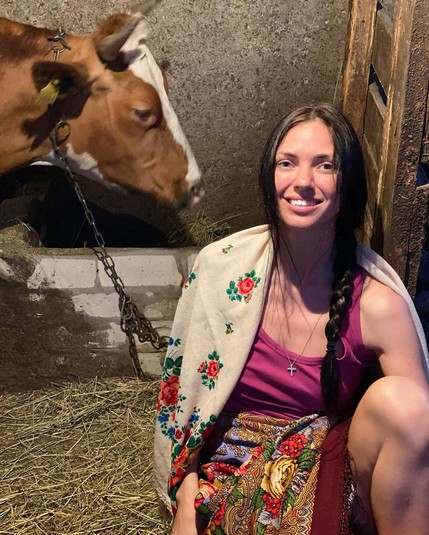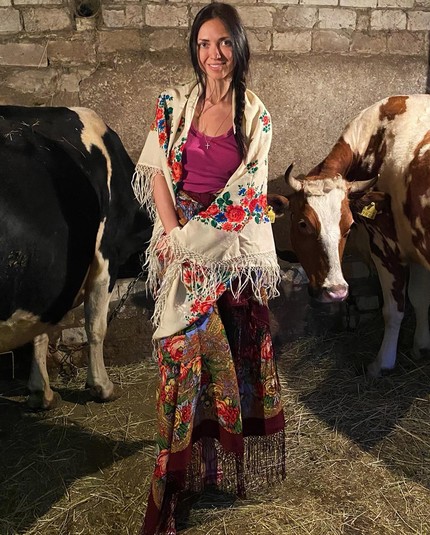 Вика поразила подписчиков своего Instagram необычным луком и атмосферной фотосессией, которую устроила прямо в коровнике вместе с его обитателями и маленькой племянницей. При этом девушка предстала в образе настоящей барышни-крестьянки - она надела розовую майку, из расписного платка соорудила себе длинную юбку, а еще один набросила на плечи как накидку. Завершают колоритный лук полное отсутствие макияжа на лице Смеюхи и слегка растрепанная коса.