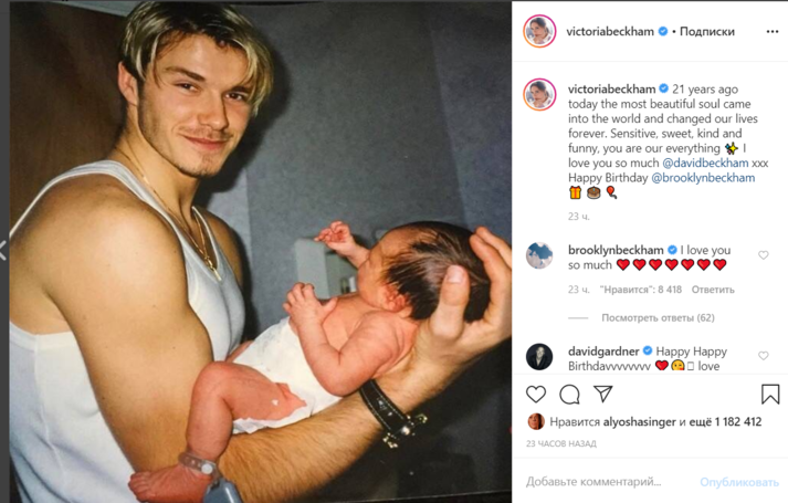 «В этот день, 21 год назад, самая прекрасная душа пришла в мир и навсегда изменила нашу жизнь. Чуткий, ласковый, добрый и веселый, ты - наше все. Я так тебя люблю, Дэвид. С Днем Рождения, Бруклин», - обратилась к близким людям знаменитость.