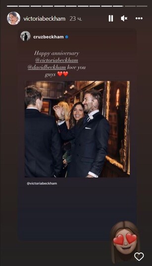 Жена мировой футбольной знаменистоти Виктория Бекхэм на своей странице в соцсети поздравила супруга с 23-летием их брака: «Они говорили, что я никогда не улыбаюсь, что это не продлится долго. Сегодня мы отмечаем 23 года брака. Дэвид, ты мое все, я так тебя люблю». Дэвид Бекхэм на своей странице разместил их общие архивные фото.