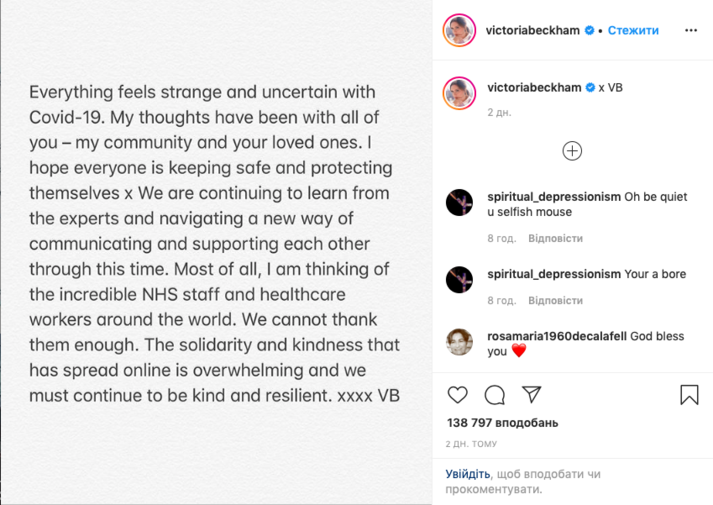 «Все кажется странным и неопределенным с COVID-19, — пишет Виктория. — Мои мысли всегда были со всеми вами – моими друзьями и вашими близкими».