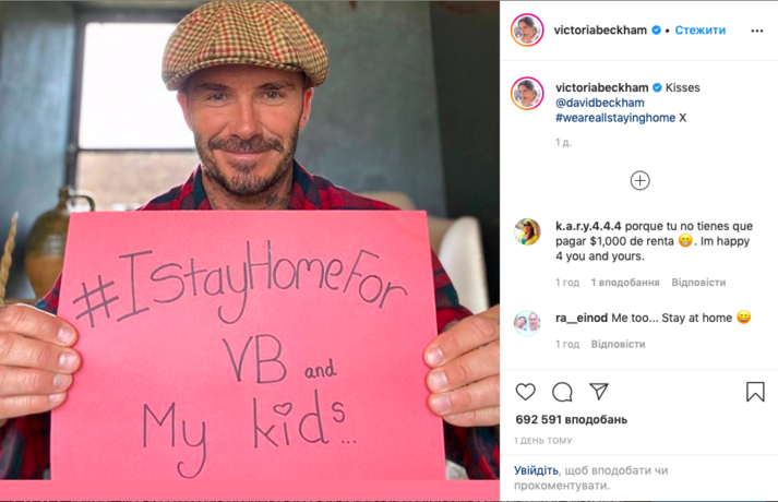 Известный экс-футболист Дэвид Бекхем в своем Instagram поделился постом, где он присоединяется к всеобщему флешмобу под хештегом #IStayHomeFor («Я остаюсь дома ради…»). К слову, спортсмен принял эстафету от известного актера Кевина Бейкона.