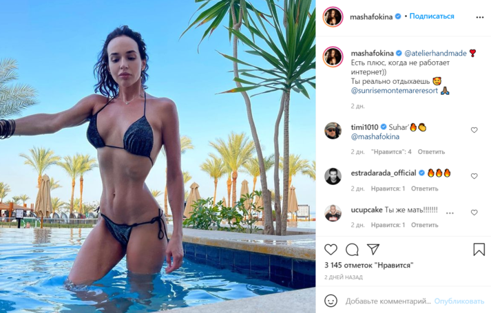 На своей странице в Instagram артистка опубликовала фото, сделанное во время ее релакса в бассейне. На снимке Маша в черном минибикини позирует стоя в воде и демонстрируя свое рельефное, накачанное тело.