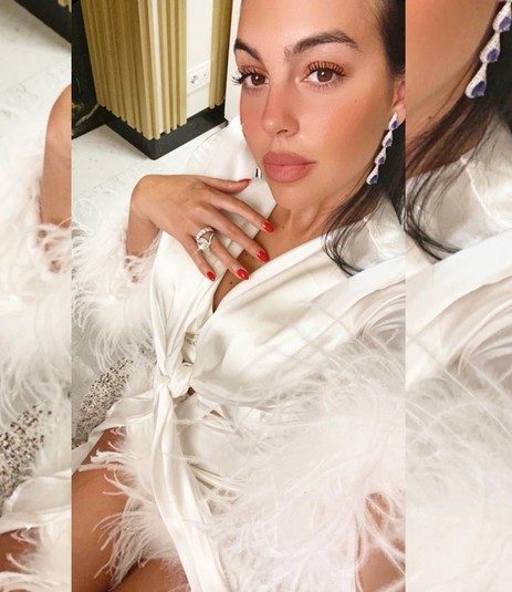 На одном из снимков Джорджина нежно обнимала любимого, а Роналду трогательно положил руку ей на грудь. На следующем кадре инстадива предстала в одиночестве: она показала свое лицо крупным планом, сместив акцент на руку, на которой красовалось роскошное кольцо с огромным бриллиантом.