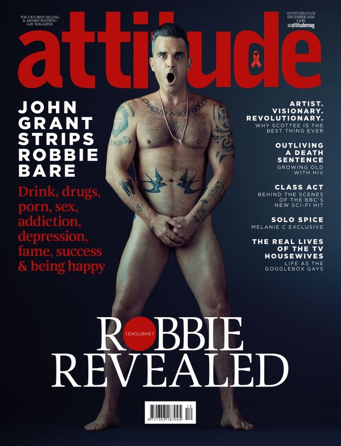 Певец появился на обложке британского журнала Attitude для секс-меньшинств полностью обнаженным — только интимное место Робби прикрыл рукой.
