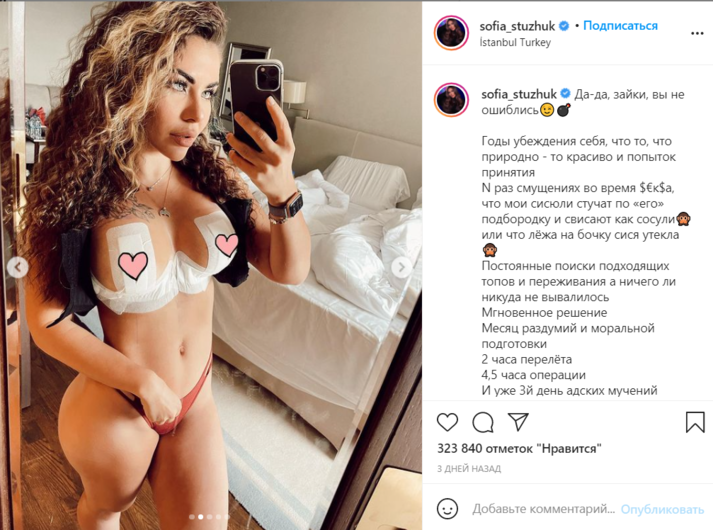 25-летняя блогерша -миллионник из Киева София Стужук, муж которой умер от коронавируса, ранее выступала за естественную красоту. Стужук считала, что нужно любить свое тело таким, каким его создала природа. Однако теперь ее убеждения изменились. По словам Софии, она внушала себе, что с ее грудью все в порядке, но при этом стеснялась себя. Особенно неловко девушке было во время секса.