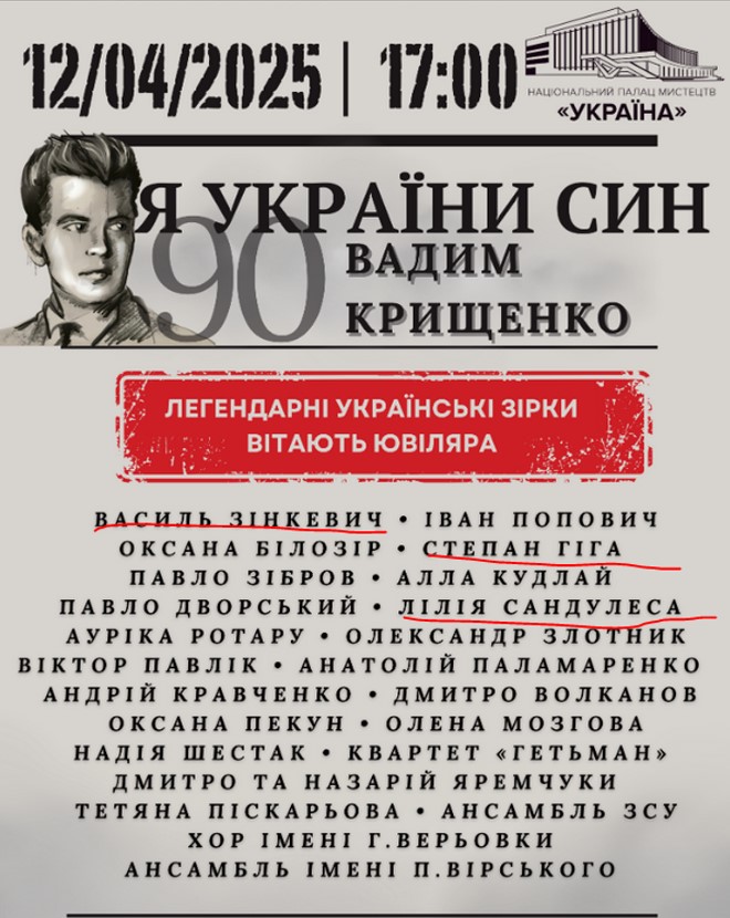 12 квітня у Національному палаці «Україна» відбувся концерт «Я – України син». Шоу було присвячене ювілею легендарного поета-пісняра, народного артистка Вадима Крищенка. «Главком» розповідає, як пройшов масштабний концерт, у якому взяли участь десятки зірок.