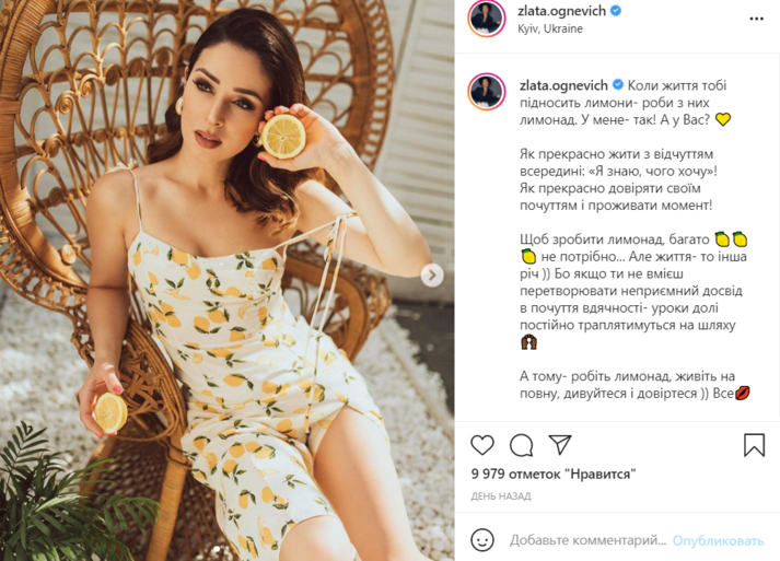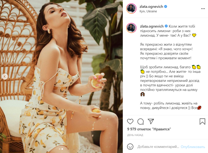 «Когда жизнь тебе преподносит лимоны – делай из них лимонад. У меня – так! А у вас? Как прекрасно жить с ощущением внутри: «Я знаю, чего хочу»! Как прекрасно доверять своим чувствам и проживать момент! Чтобы сделать лимонад, много лимонов не нужно... Но жизнь – это другое дело. Потому что если ты не умеешь превращать неприятный опыт в чувство благодарности – уроки судьбы постоянно случаться на дороге. И поэтому – делайте лимонад, живите на полную, удивляйтесь и доверьтесь», – написала в фотоблоге Злата.