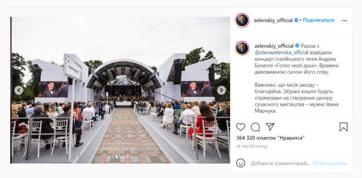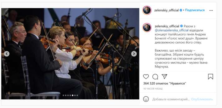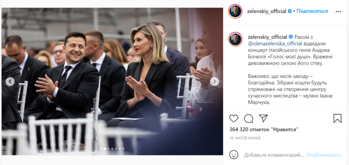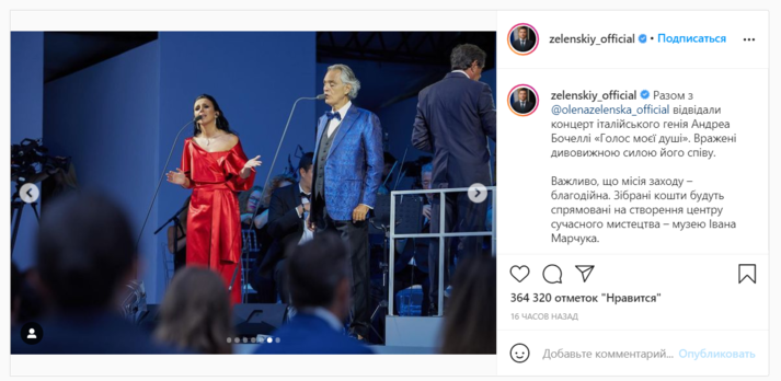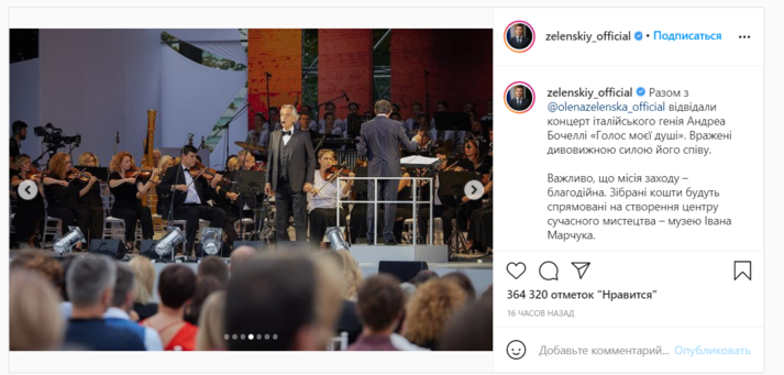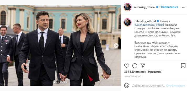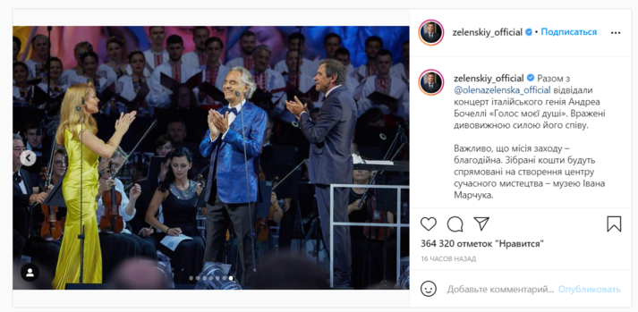 «Вместе с Еленой Зеленской посетили концерт итальянского гения Андреа Бочелли «Голос моей души». Пораженные удивительной силой его пения», - написал Зеленский.