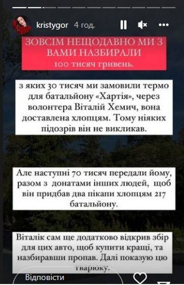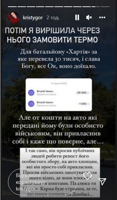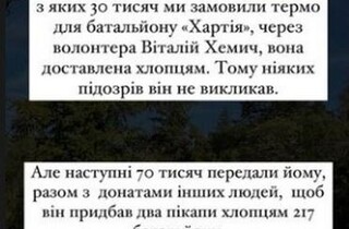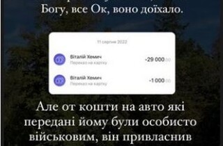 Жена телеведущего Владимира Остапчука на своей странице в соцсети написала об украинце, который присвоил деньги, которые предназначались для наших защитников. На своей странице в Инстаграм она рассказала, что собирала средства для покупки двух авто одному из подразделений ВСУ. Средства перевели волонтеру, с которым уже сотрудничала, однако в этот раз он обманул: машины так и не были доставлены по назначению, а 70 тысяч гривен пропали, как и сам волонтер Виталий Хемич, которому были переданы средства.