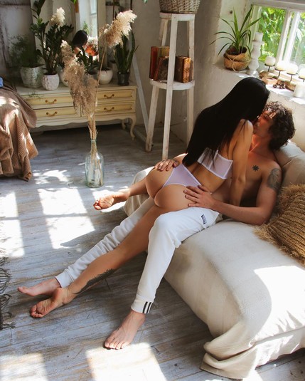 Так, пара снялась в откровенной фотосессии. Перед фотообъективом полуобнаженные влюбленные позировали на диване. В частности, Наталья в белом нижнем белье оседлала Женю, который был только в белых штанах.