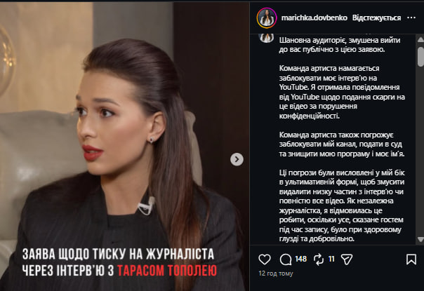 Команда співака Тараса Тополі намагається заблокувати інтерв’ю у YouTube, яке він нещодавно дав журналістці та блогерці Марічці Довбенко. Про це у своїх соцмережах заявила сама Марічка Довбенко та розповіла про погрози від адвоката та команди артиста. Про це пише «Главком» із посиланням на допис журналістки.