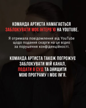 «Команда артиста також погрожує заблокувати мій канал, подати в суд та знищити мою програму й моє ім’я. Ці погрози були висловлені в мій бік в ультимативній формі, щоб змусити видалити низку частин з інтерв’ю чи повністю все відео», – йдеться в дописі Довбенко.