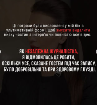 Крім цього, у коментарях під своїм дописом інтерв’юєрка пояснила, що саме від неї вимагали представники Тараса Тополі. «Мене не просили видалити, а вимагали в ультимативній формі. І не якийсь один два моменти, а 10 шматків», – додала блогерка.