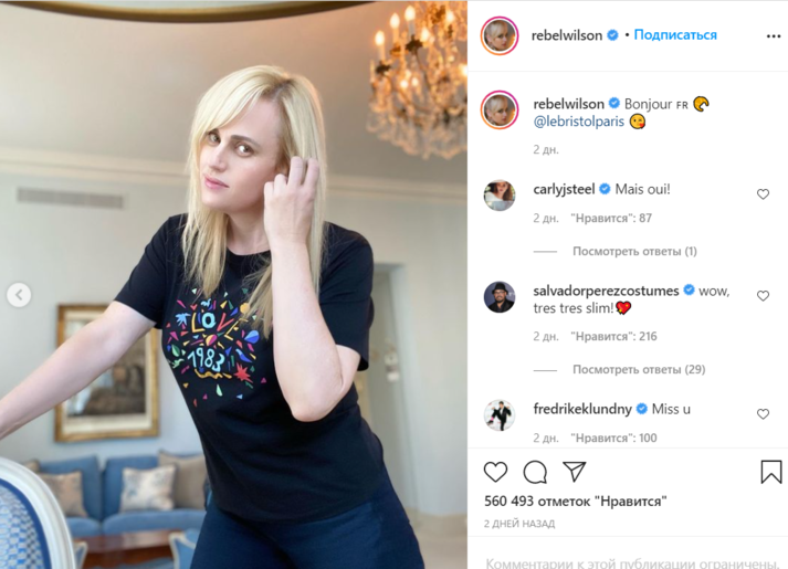 «Добрый день», — подписала актриса пост, который набрал 284 тысячи лайков. Подписчики восхитились ее внешним видом в комментариях под публикацией. «Какая же ты красотка!», «Похудевшая королева», «Так держать, Ребел! Я восхищаюсь тобой», «Вот это талия!», «Самая красивая актриса», — высказывались поклонники.
