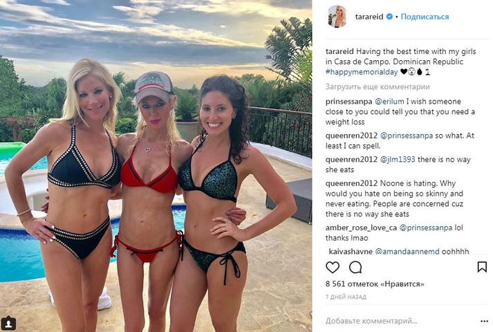 Рид выложила фотографии в бикини и на фоне своих подруг выглядит слишком истощенной. В комментариях испуганные фолловеры сразу стали писать: «Тара, сходите поешьте», «Вы превращаетесь в мумию», «Зачем вы так себя мучаете?» и много всего подобного. Актриса признавалась, что несколько лет назад действительно страдала от анорексии, но теперь полностью поправилась и чувствует себя здоровой, вот только по новым фотографиям Тары поверить в это трудно.