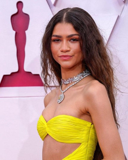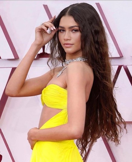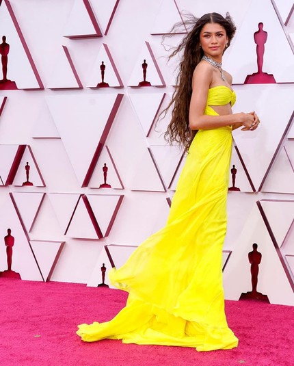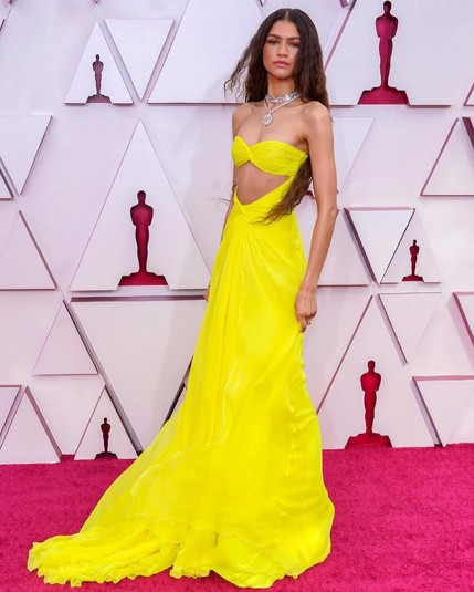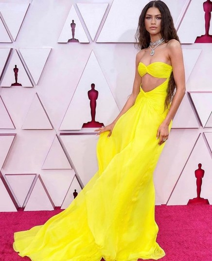 24-летняя певица, актриса и модель Зендая Мари Штермер Коулман совершила эффектный выход в свет. На ковровой дорожке восходящая голливудская звезда выбрала эксклюзивное желтое платье от Valentino, сшитое на заказ. Его верх состоял из бюстье без бретелек с вырезом в форме сердца. Платье плавно перетекало в юбку с пикантным вырезом на плоском животе артистки.