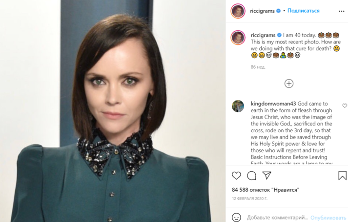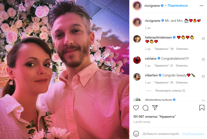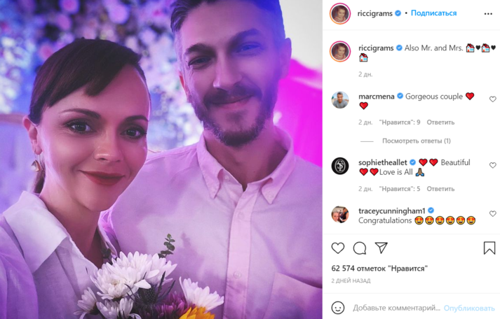 Звезда фильма «Семейка Аддамс» Кристина Риччи вышла замуж во второй раз Об этом она объявила в своем Instagram, выложив совместную фотографию с подписью «Мистер и миссис».