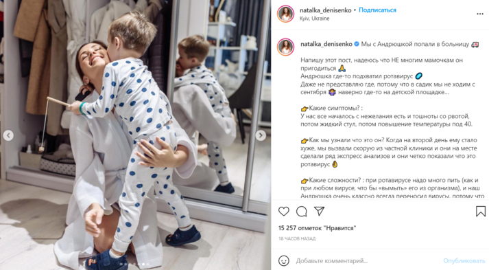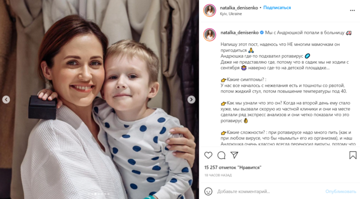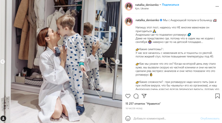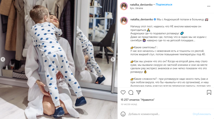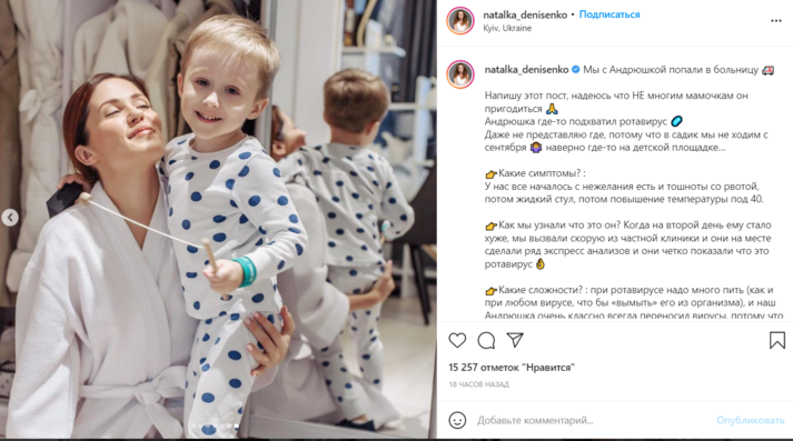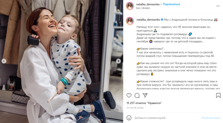 Также артистка решила поделиться с подписочницами-мамами информацией о симптомах и лечении. Денисенко отметила, что сын с сентября не ходит в детсад, поэтому, скорее всего, вирус он подхватил на детской площадке. А началось все с «нежелания есть и тошноты с рвотой».