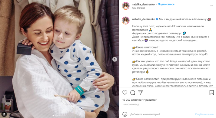 Популярная украинская актриса Наталка Денисенко в своем Инстаграме сообщила, что попала в больницу со своим четырехлетним сыном Андрюшей.