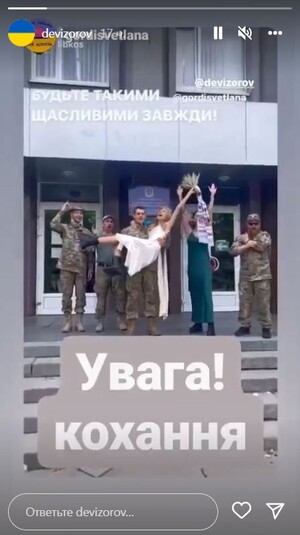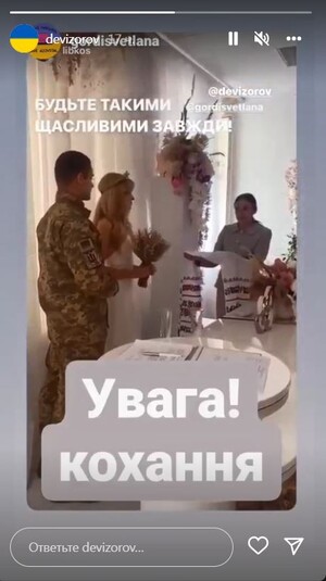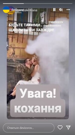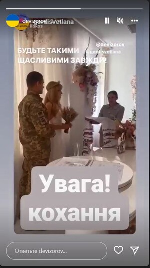 Актер Максим Девизоров, известный ролью Дениса в сериале «Первые ласточки» женился на своей коллеге – актрисе Светлане Гордиенко, которая известн зрителям по сериалу «Плут». Девизоров служит в Вооруженных силах Украины, его отпустили на торжество всего на один день.
