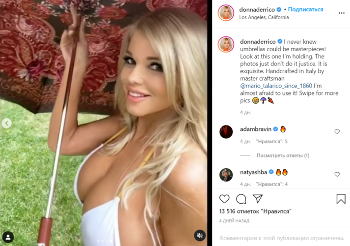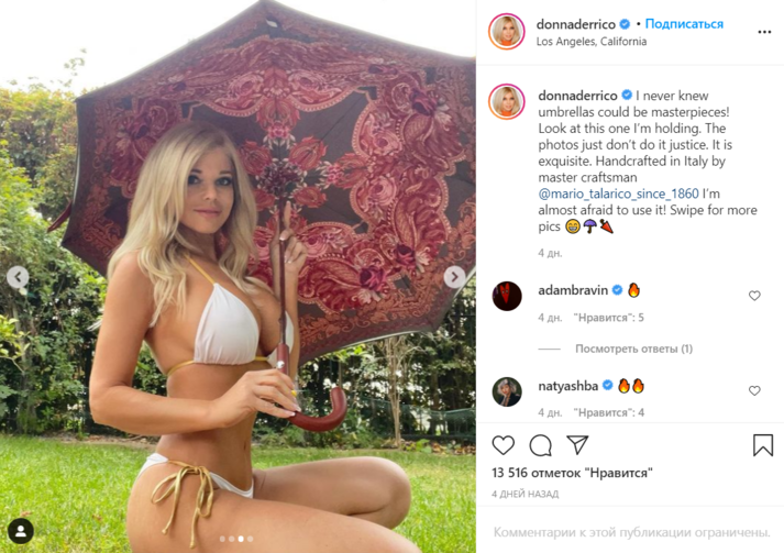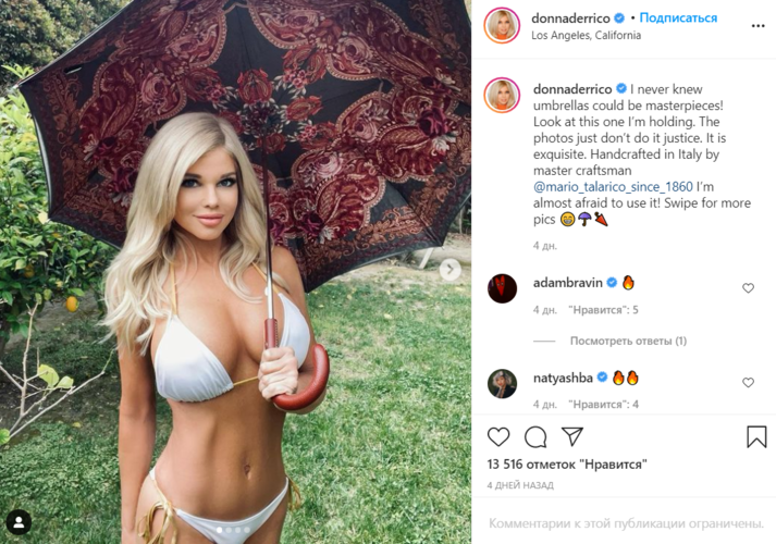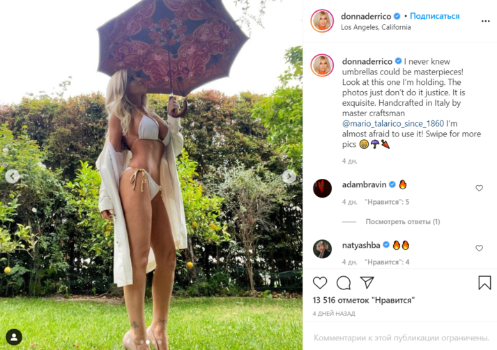 Донна Д'Эррико решила напомнить подписчикам в Инстаграме, что 53 для нее — просто цифра. Блондинка выложила снимки, где позирует в бикини на фоне зелени, держа в руках зонтик.