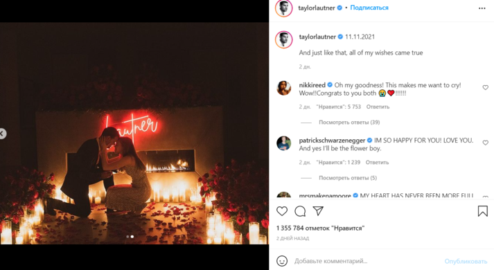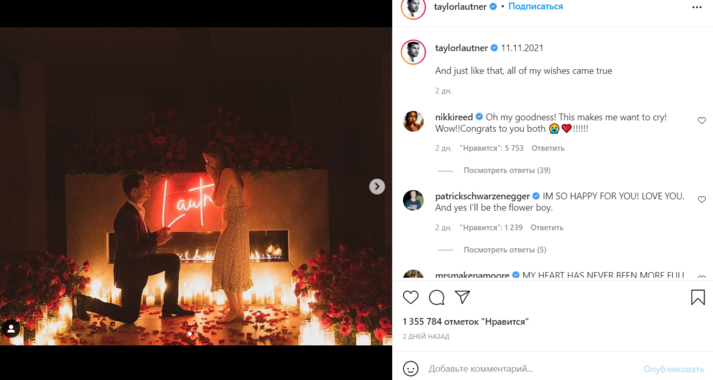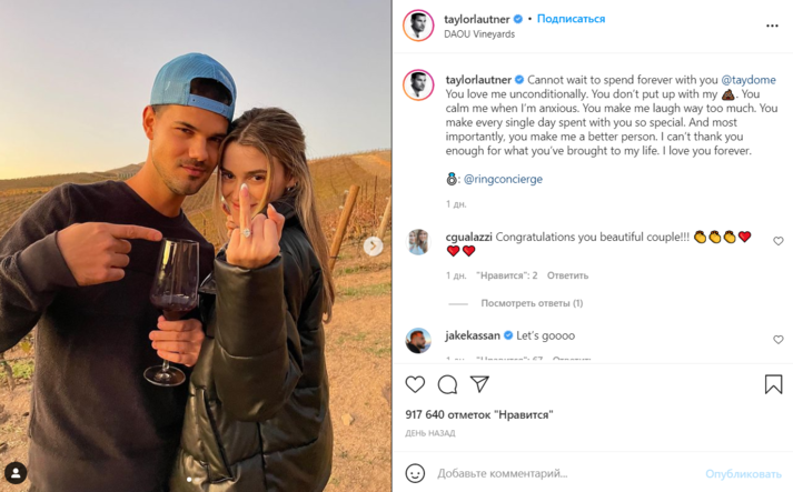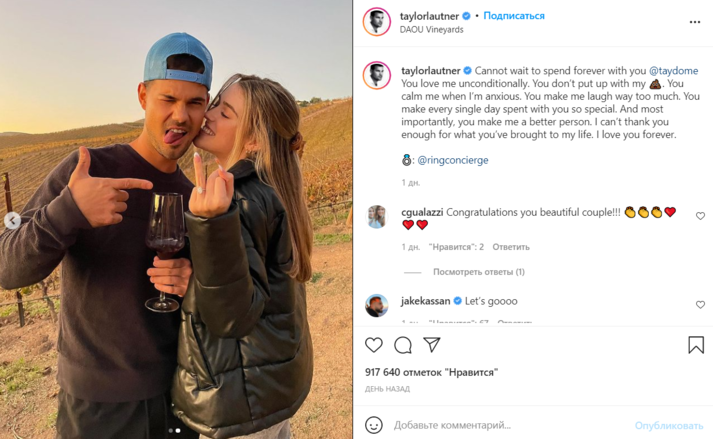 Вслед за своей «сумеречной» возлюбленной Кристен Стюарт связать себя узами брака решил Тейлор Лотнер. 29-летний актр сделал предложение своей девушке Тэй Доум, с которой встречается три года, об этом он сообщил в свом Instagram.