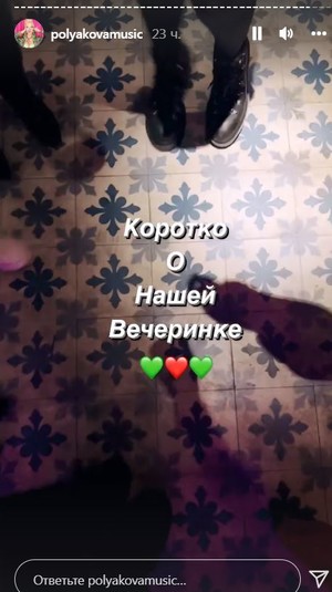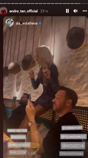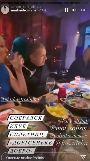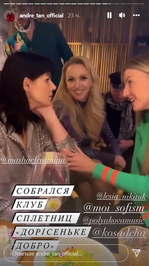 Через несколько часов гости в своих сторис в Инстаграм приоткрыли завесу звездного гуляния. Говорили много тостов, в частности, Катя Осадчая очень радовалась за Полякова, что та не забывает времена, когда совсем молодой девушкой пробивалась на сцену. Дизайнер Андре Тан запечатлел зажигательные танцы Поляковой, Ефросининой, Астафьевой, Плакидюк и других участников праздника. Танцевали и пели – под песни Поляковой. В это время Горбунов что-то бурно обсуждал с Никитюк, а Осадчая – с Ясинским. Позже дизайнер «засветил» троицу – Полякова, Ефросинина и Никитюк – за каким-то интересным разговором. У Андре своя версия этой беседы: «Самые последние сплетни: убил, съел, закопал».