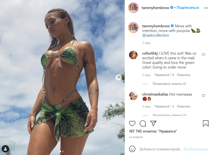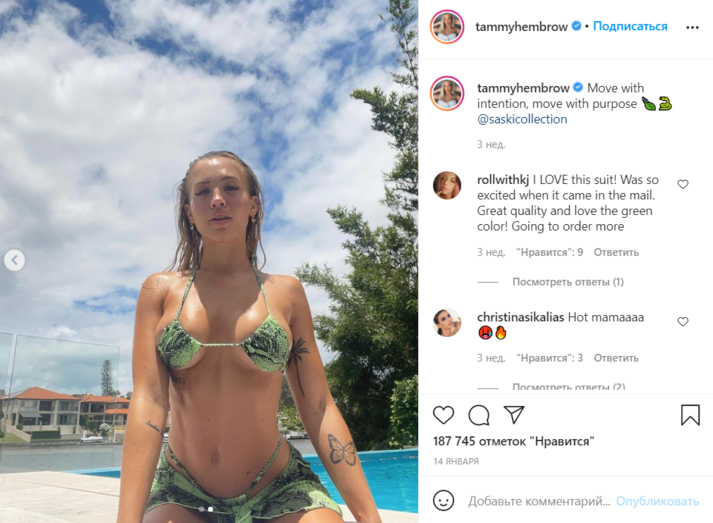 Тренд поддержала и австралийская модель Тэмми Хемброу. В своем Instagram-аккаунте она разместила снимок в крошечном бикини анималистичной расцветки. Пост набрал почти 190 тысяч лайков, однако некоторые подписчики знаменитости подчеркнули, что ей следует носить верх «правильным образом».