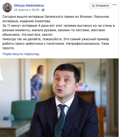 Журналистка и видеоблогерка Олеся Медведева на своей странице в Фейсбуке возмутилась поведением спикера президента Юлии Мендель во время интервью Владимира Зеленского в Японии