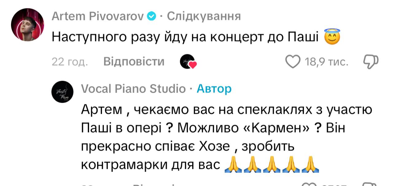 Відео з виконанням гімну розлетілося мережею, його опублікувала дружина співака. На це відео відреагував сам Артем Пивоваров та залишив коментар під дописом: «Наступного разу йду на концерт до Паші». Родина оперного співака також відповіла Артему Пивоварову: Артем, чекаємо вас на спектаклях з участю Паші в опері? Можливо «Кармен»? Він прекрасно співає Хозе, зробить контрамарки для вас.