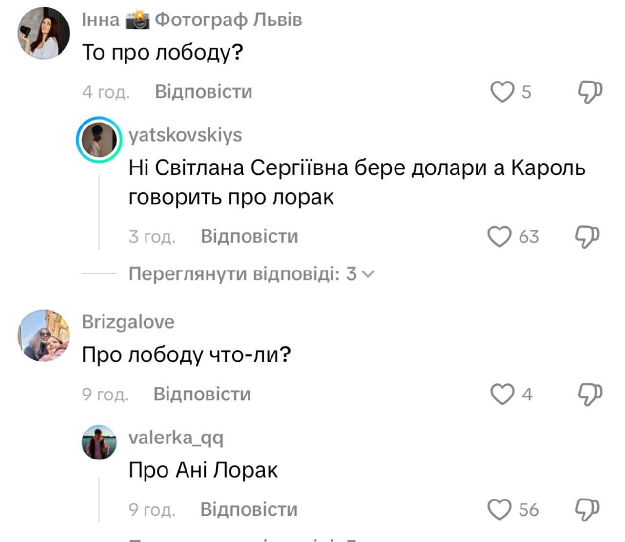 Така ж реакція була й у коментарях під відео із заявою Кароль. Користувачі зазначили, що своє звернення співачка присвятила Ані Лорак. Однак інші коментатори припустили, що Тіна Кароль звернулася до Світлани Лободи. Однак варто зауважити, що Лобода не поверталася в РФ після початку повномасштабного вторгнення та наразі часто з'являється на світських заходах в Україні.
