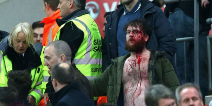 Так тривало до пори до часу, поки інший фанат Трьох Левів не вийшов із себе. Коли терпець вболівальника урвався, він повернувся до агресивного фанату і накинувся на опонента, розбивши йому обличчя. На щастя потерпілого, поруч виявилися стюарди, які швидко розняли забіяк, проте вболівальник все ж отримав розсічення. Його обличчя повністю покрилося кров'ю, але, незважаючи на це фанат продовжував активно підтримувати збірну Англії.