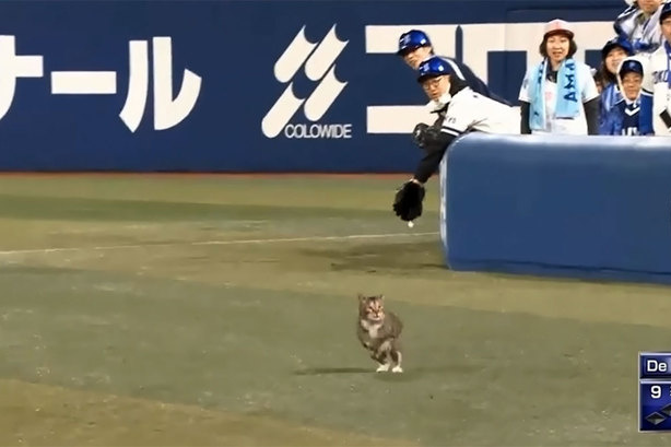 Тварина з'явилася на стадіоні на останніх хвилинах гри між командами Hanshin Tigers і Yokohama Bay Stars, що відбулася в японському місті Йокогама. Промчав по полю в різних напрямках, явно ошелешений тим, що відбувається кіт застрибнув в технічну зону на трибунах, де розміщується телевізійне обладнання, де і зник.