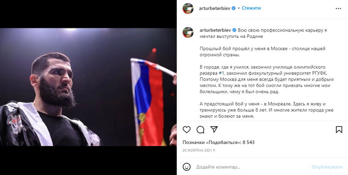 Для того щоб переконатися, що Бетербієв представляє російський бокс, а не канадський, достатньо зайти на його сторінку в Instagram. Там вихідець із Чечні красується на тлі державних символів країни-агресора.